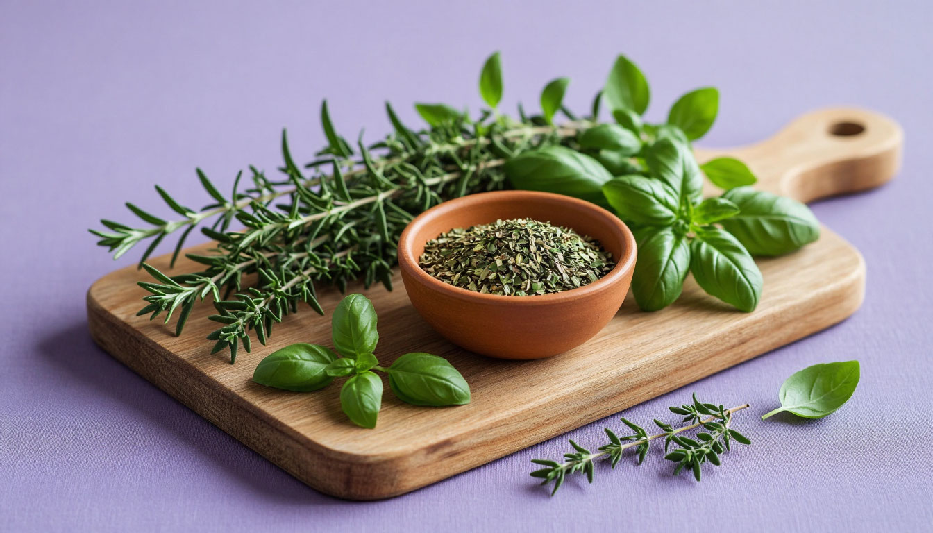 Тимьян 30%, розмарин 25%, орегано 20%, базилик 15%, майоран 10%. Покупайте цельные листья — ароматнее порошка. Добавьте лаванду 5% для аутентичности.