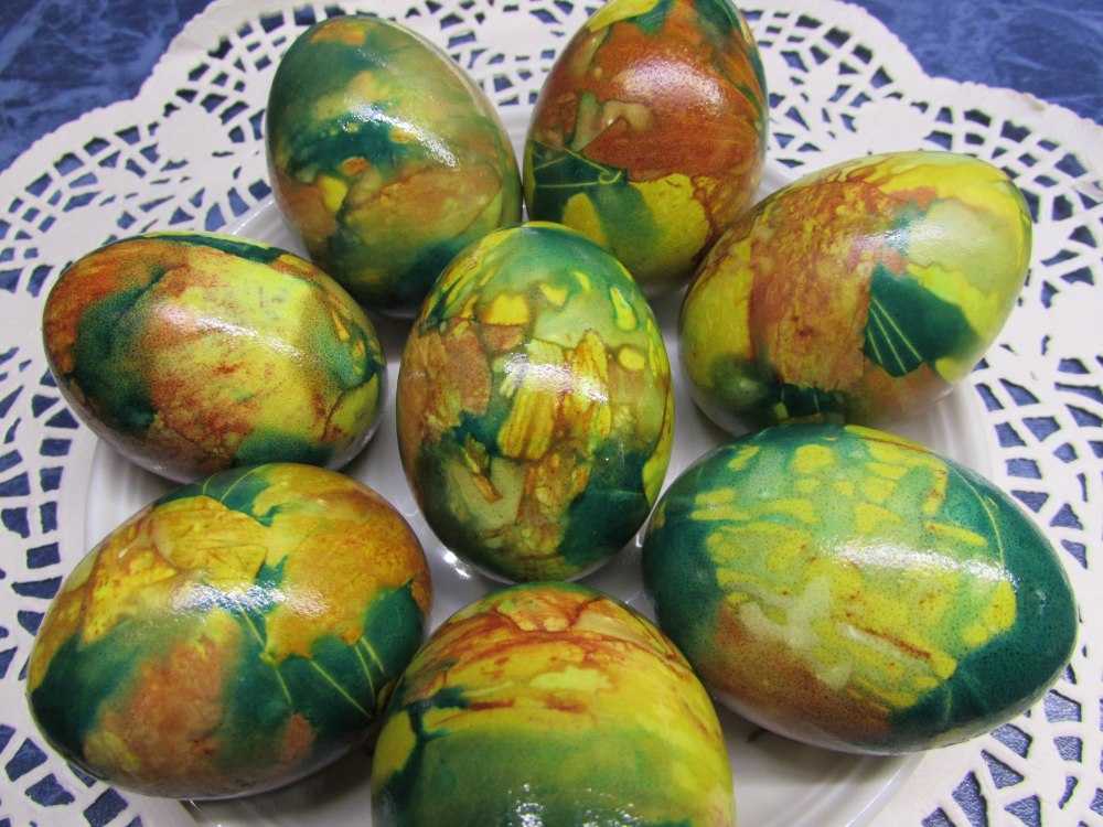 “Как и все хозяйки, я крашу к Пасхе куриные яйца, которые у нас называют крашенки. Хочу предложить свой метод окраски пасхальных куриных яиц. Готовим очень просто, а яйца приобретают красивый мраморный вид. При окраске мраморных яиц я использую луковую шелуху и зеленку, но если зеленка вам не по душе, ее можно не добавлять совсем”.