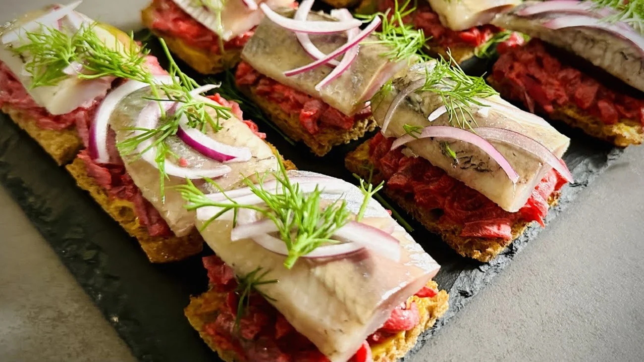 Эти бутерброды с селедкой – превосходная закуска для праздничного стола. Они быстро исчезают со стола и выглядят очень празднично.