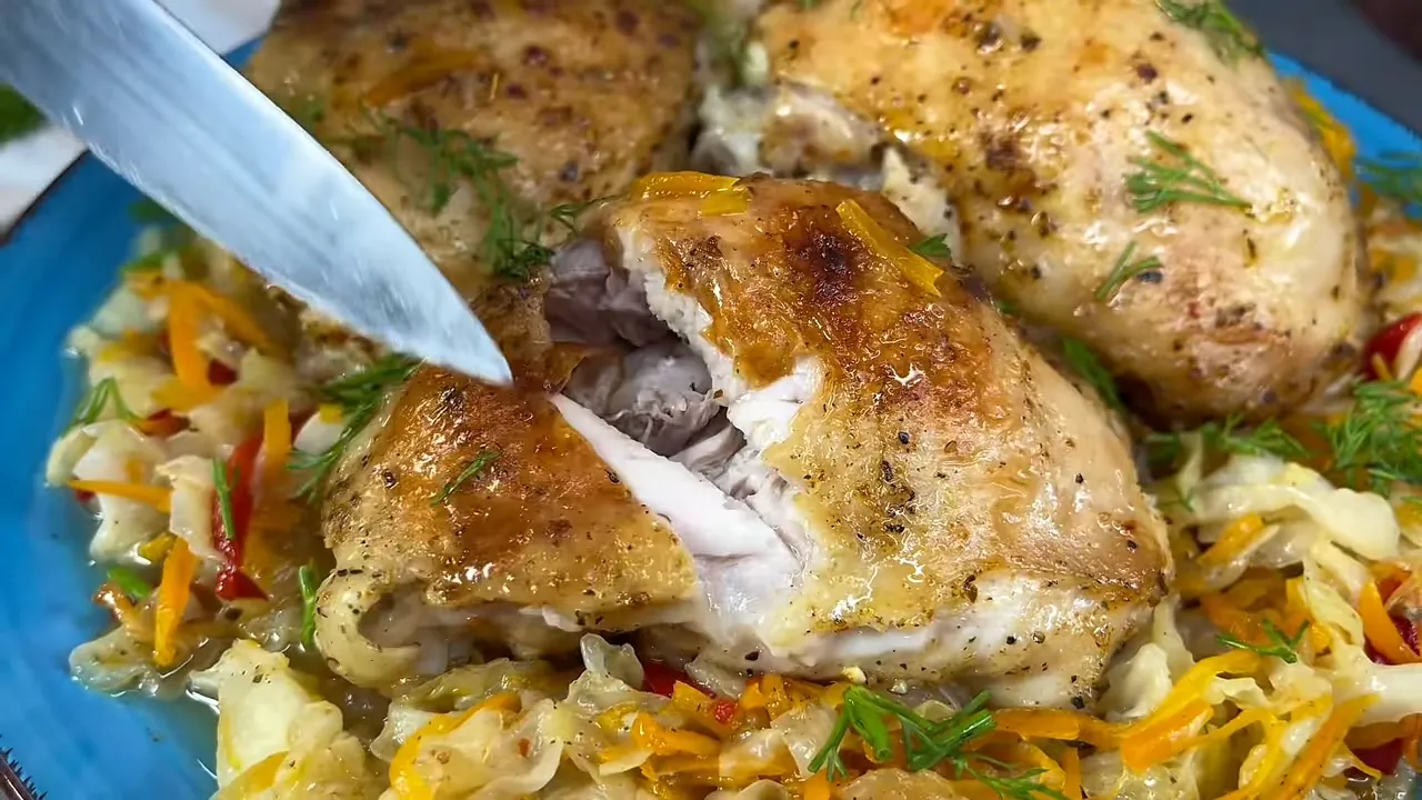 - Положите овощи в пакет для запекания, создав импровизированную подушку, а сверху на нее выложите замаринованные бедра. Пакет завяжите шпагатом или закрепите специальной клипсой. С помощью зубочистки проколите в нескольких местах пакет и отправьте в предварительно прогретую до 190° духовку на 1 час.