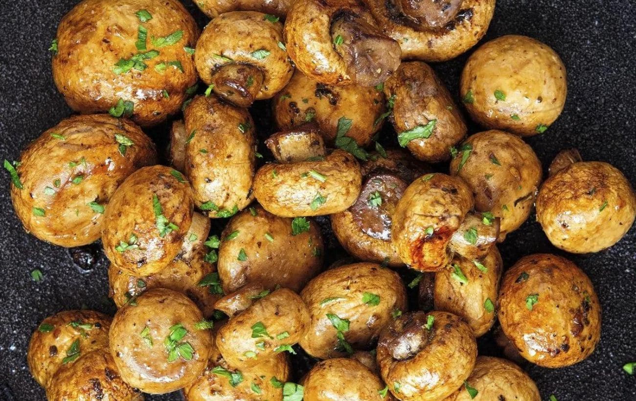 Приготовление этой закуски невероятно быстрое и простое. Начните с промывания шампиньонов холодной водой и просушите их бумажным полотенцем. Удалите кончики ножек шампиньонов (если они загрязнены или слишком жесткие) и приступайте к нарезке. Идеально выбирать грибы такого размера, чтобы их можно было жарить целиком – так закуска будет выглядеть эффектнее. Если же таких шампиньонов не нашлось, разрежьте их максимум пополам. Разогрейте сковороду на среднем огне, добавьте растительное масло и дайте ему нагреться.